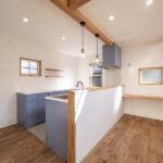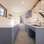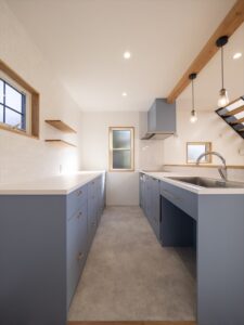 キッチンはブルーが鮮やかな
