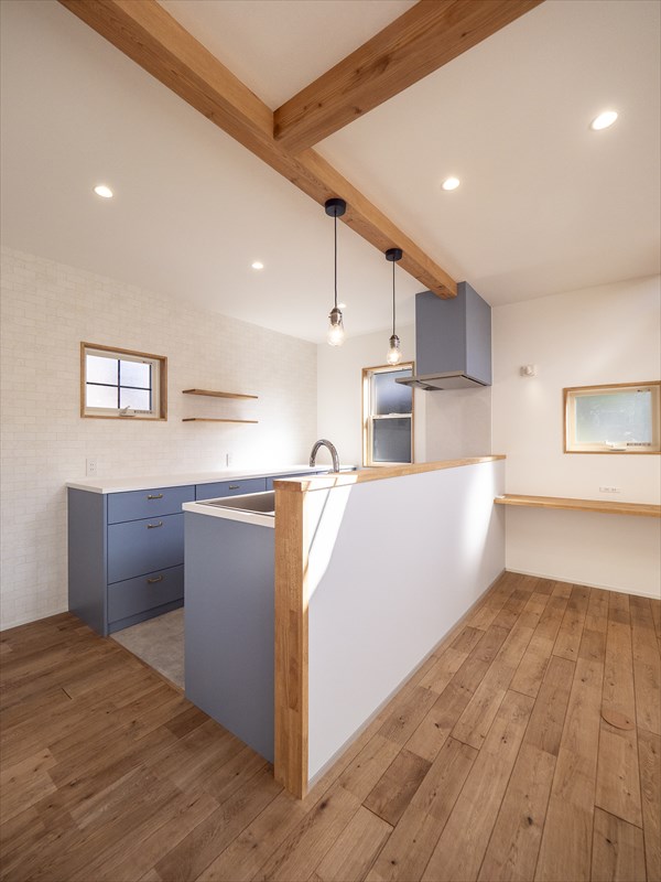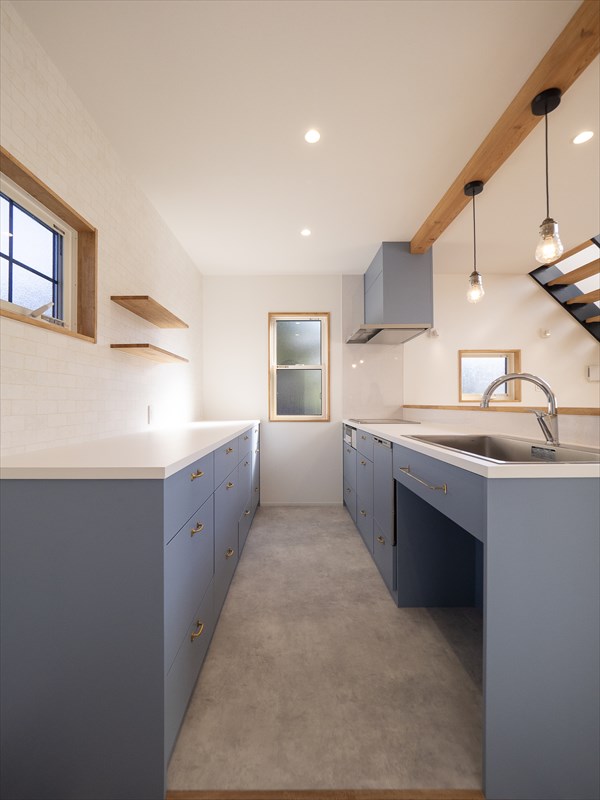 キッチンはブルーが鮮やかな