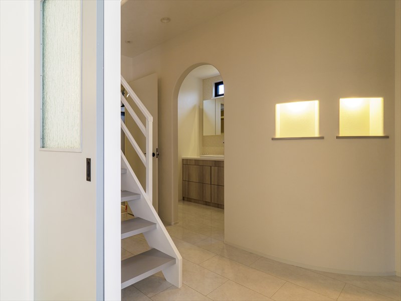 ガレージハウス 【広島県】ホテルライクなガレージハウス 広島県 S様邸 お友達を沢山呼んでも広々過ごせるリビングは テレビボードを壁付け。 タイルを施しホテルライクな空間に。 照明が可愛い玄関は大容量のシューズクローク お客様と家族の玄関を分けられる間取りに 取っ手の一方をタオルハンガーにした アイディア溢れる造作洗面台 GALLERY一覧はこちら
