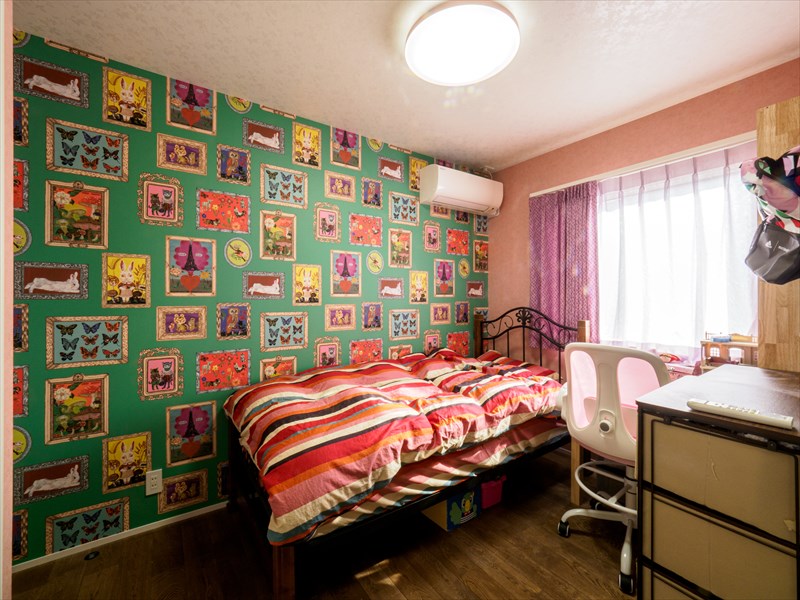 二階建てにもかかわらず、なんと間取りは1LDK+ガレージ。横並びの子供部屋空間は、一つだけにスライドドアで個室になる造り。もう一方は主寝室と隣り合う形になる。寝具のカラーも特徴的だが、こちらは二階のリビングカーテンと同じものを特注作成で採用。腰壁の柄がトイレの壁紙とリンクしていたり、柄の遊び心が満載だ。