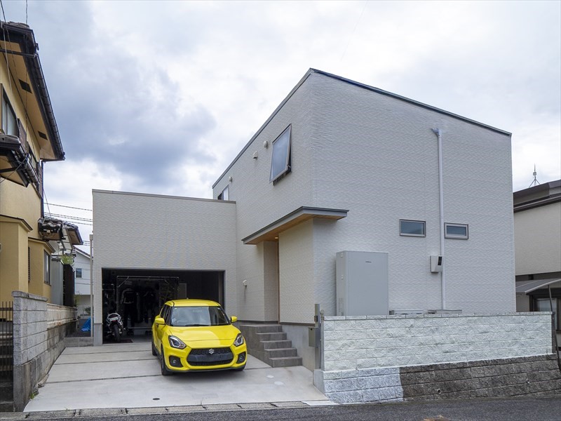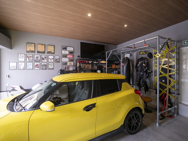 白を基調とした落ち着いた外観に、鮮やかな黄色の愛車が映える。ガレージ前には洗車スペースも確保され、車好きの心をくすぐる設計となっている。外観からは想像できないほど、内側には「夢の詰まった男の空間」が広がっている。