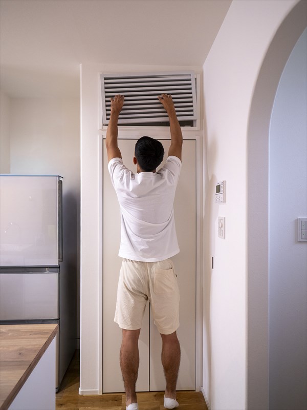 空調や換気設備は造作家具の中にすっきりと収め、デザイン性とメンテナンス性を両立。取り外し可能な格子パーツを設け、掃除のしやすさにも配慮している。